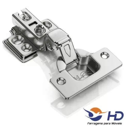 A dobradiça conta com um sistema de montagem de calço 4 furos, permitindo uma melhor fixação ao móvel e com sistema de amortecimento.
