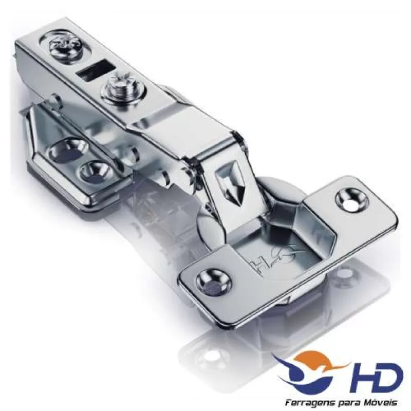 A dobradiça conta com um sistema de montagem de calço 4 furos, permitindo uma melhor fixação ao móvel, com sistema de amortecimento e engate rápido integrado.