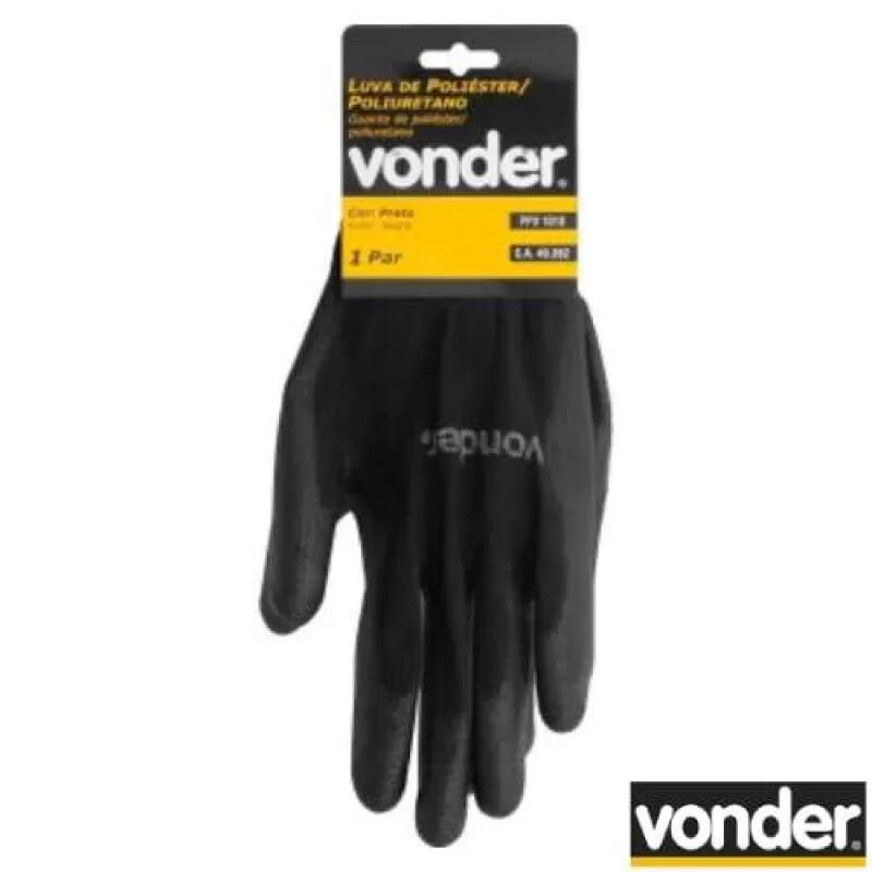 Luvas de segurança em poliéster, revestida com material em poliuretano na palma e nos dedos, punho em elástico e acabamento em overlock.